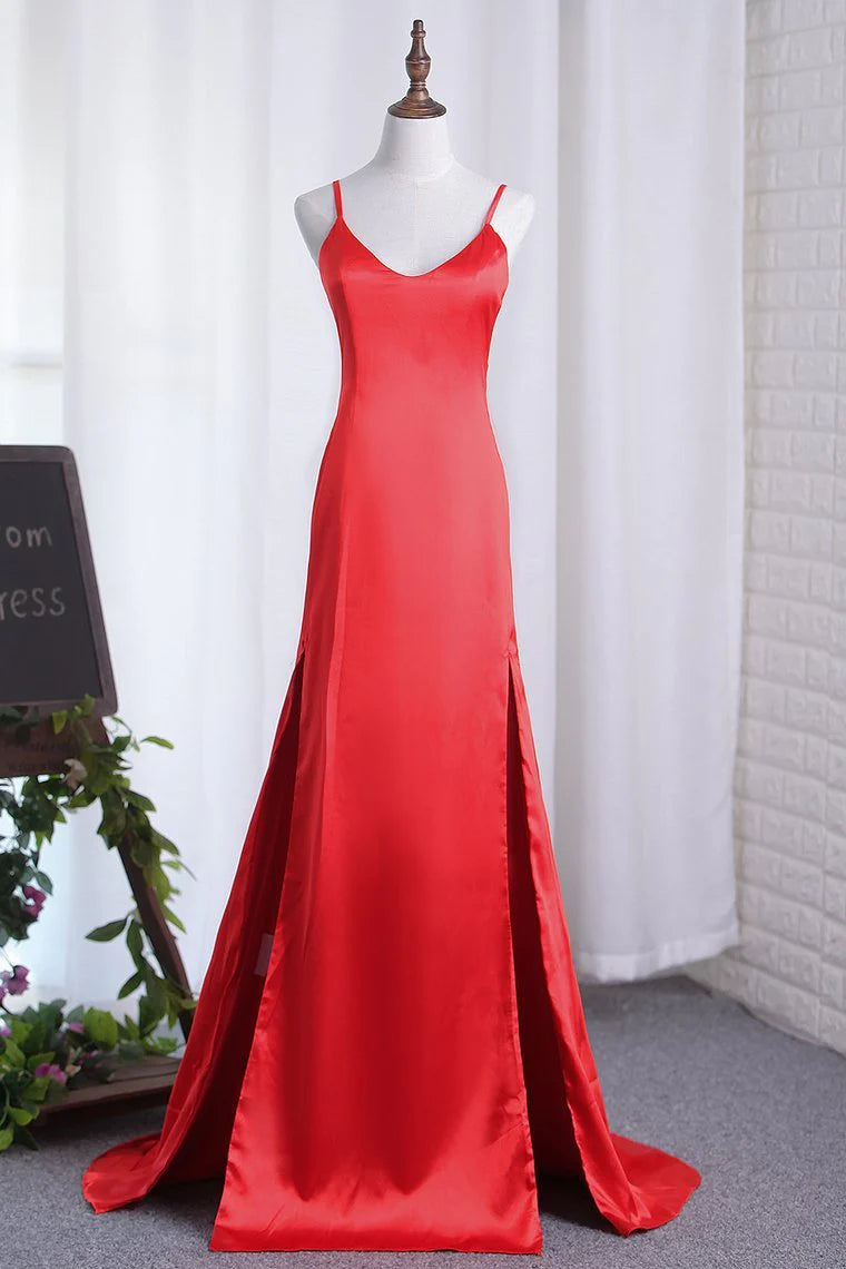 Sexy Sheath/Column Red Slit Party Dresses Elastic Satin