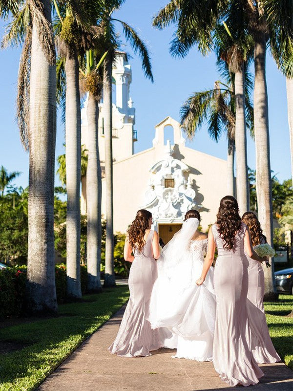 Sheath/Column Sleeveless Sheer Neck Sweep/Brush Train Stretch Crepe Bridesmaid Dresses