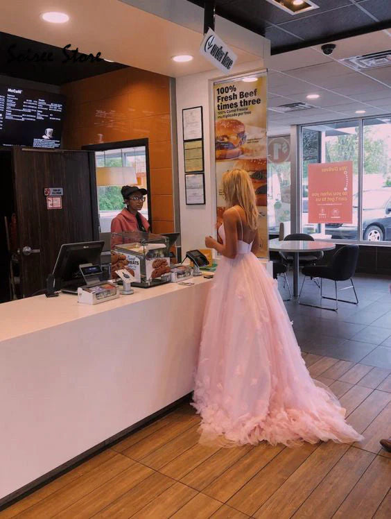 Spaghetti Straps Prom Dresses Scoop Long Cheap Dance Dress With Flowers