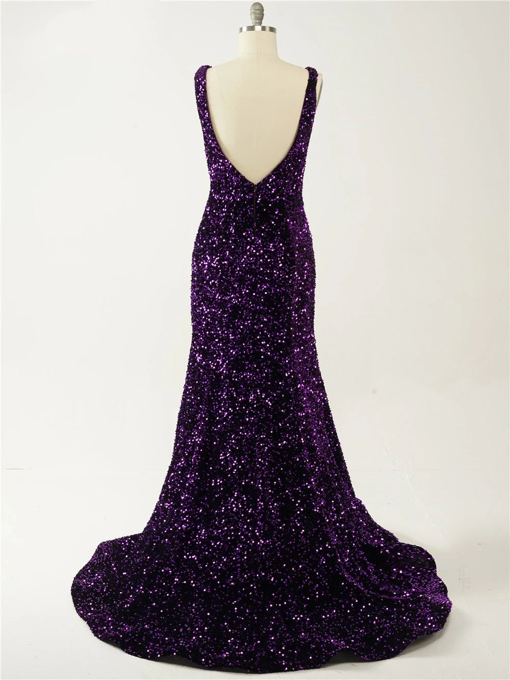 V-Neck Sweep Train Backless Straps Velvet Sequins Prom Dresses